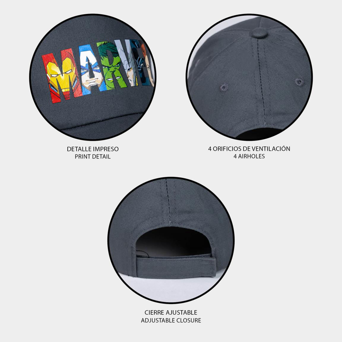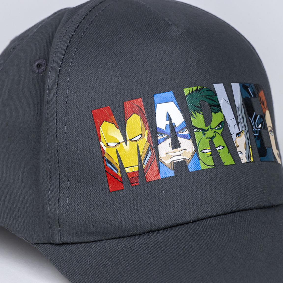 Gorra Marvel, color gris, con 4 orificios de respiración y cierre ajustable.